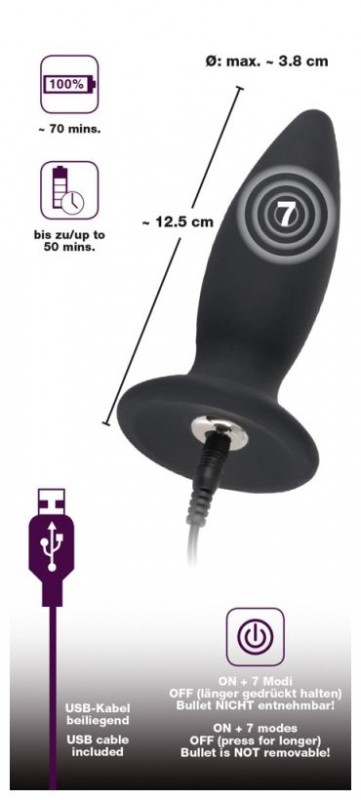 Пробка имеет 7 различных режимов вибрации, при помощи которых, Вы испытаете совершенно новые анальные ощущения и максимально расслабите анальную зону перед половым актом! Мощная вибрация проникает в каждую клеточку и идеально отвлекает от дискомфорта
