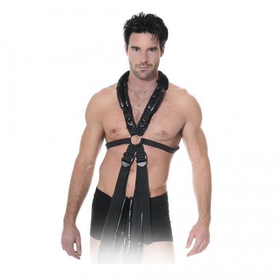 Фиксация крепится на мужчине как сбруя, и женщина удерживается на весу при помощи петель для ног и специальных креплений на шее мужчины