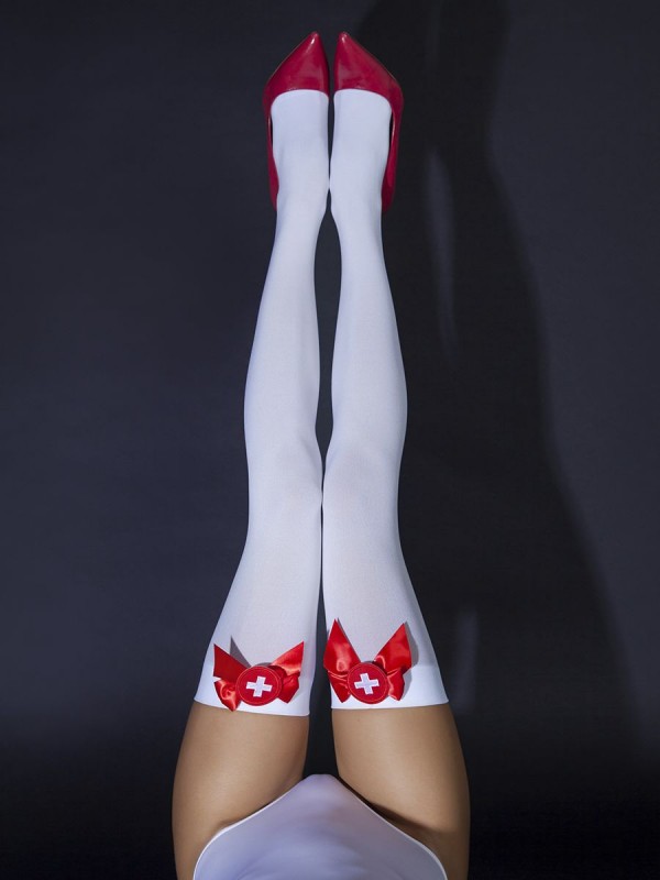 Плотные белые чулки с объемными красными атласными бантами и медицинской символикой акцентируют особенное внимание на женских ножках!