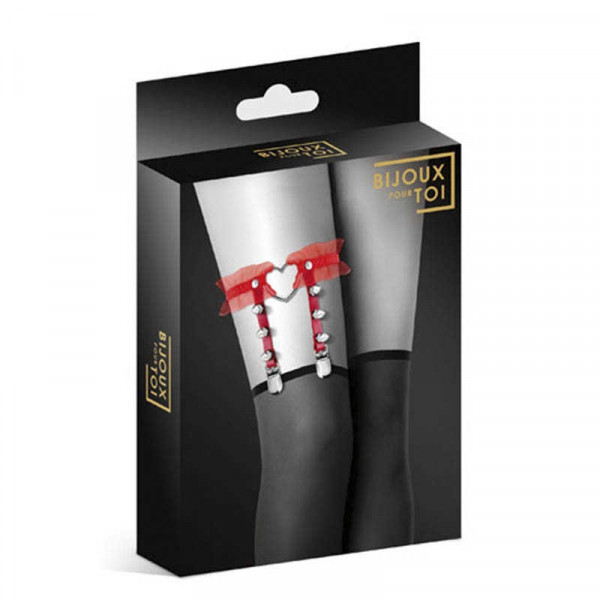 Выполнен гартер в виде шифоновой подвязки на ногу, в центре которой металлическое сердечко. Пажи выполнены из экокожи и декорированы острыми металлическими шипами. Металлические застежки отлично фиксируют гартер к чулку