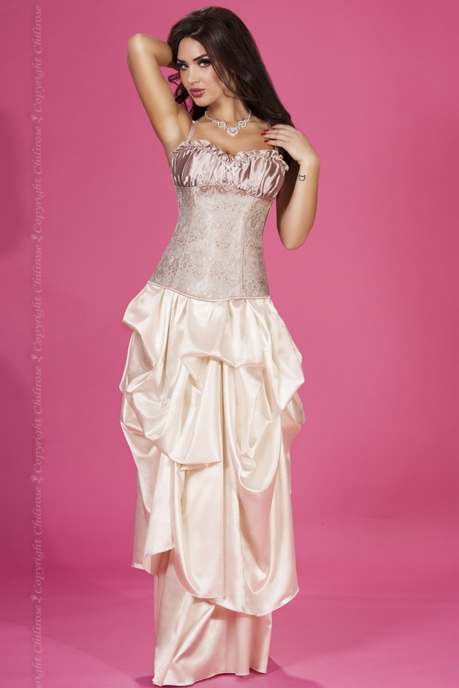 Цвет кор­сета заво­ражи­вает бук­вально с пер­вого взгляда - золо­ти­стая пудра… Атлас­ный объем­ный лиф пре­красно смот­рится как на маленькой, так и на большой груди. Низ кор­сета выпол­нен из плот­ной ткани с выби­тым узо­ром. Лож­бинка украшена двумя пуго­вич­ками в виде кри­стал­ли­ков, что придает образу осо­бый шарм…