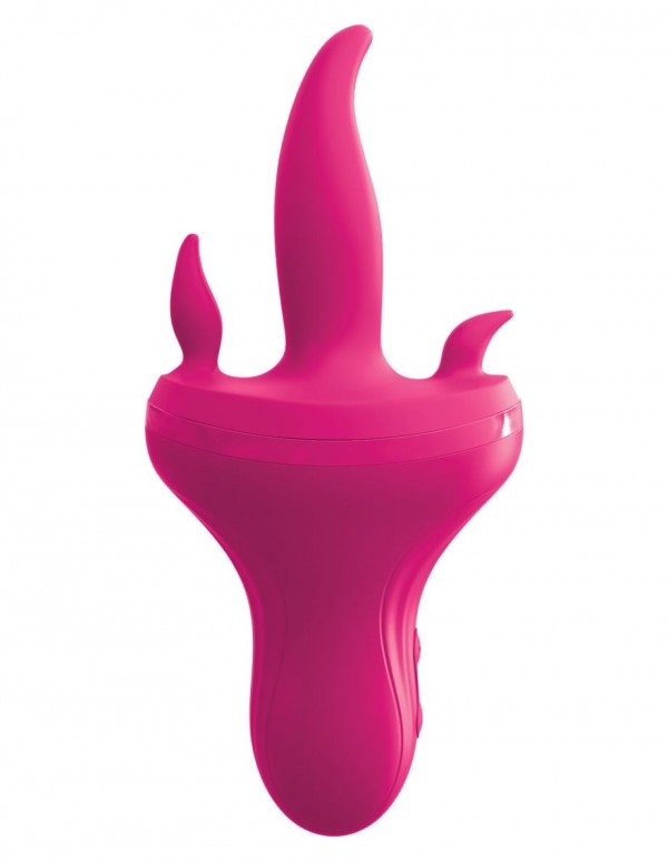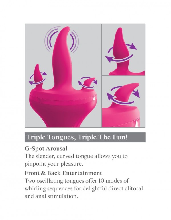 Вибратор представляет собой 3 язычка, 2 из которых предназначены для стимуляции клитора и ануса, а центральный для ласк лона и стимуляции G-точки! Вагинальный язычок обладает мощной вибрацией, а мини язычки вращаются в различных направлениях!